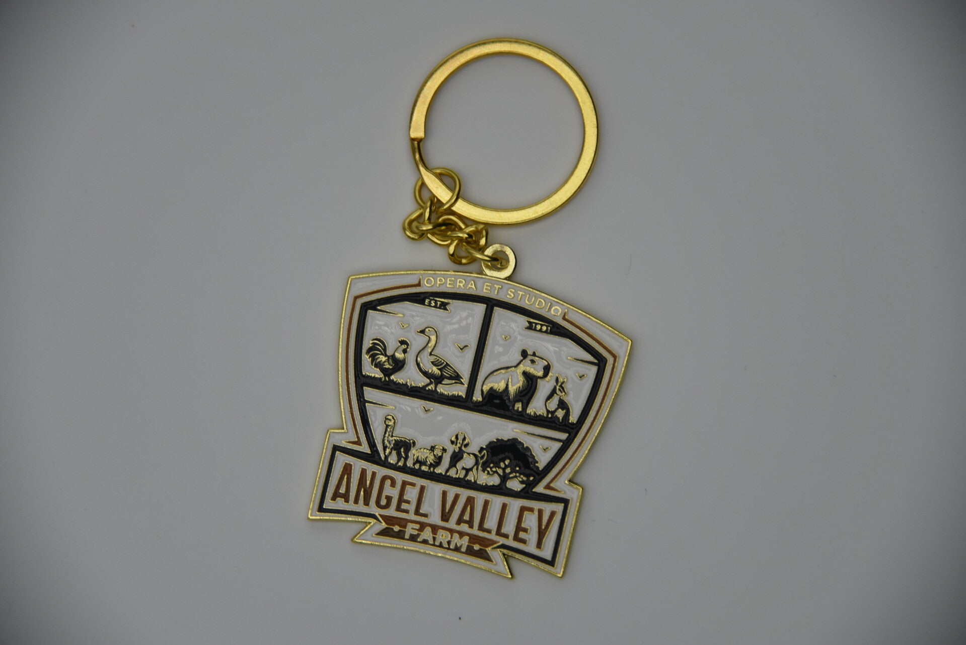 Show your support for Angel Valley Farm with this exclusive keychain featuring the official farm logo! Crafted with a striking gold-tone finish, this sturdy metal keychain displays iconic animal figures and the "Angel Valley Farm" name, making it a standout accessory for any fan or visitor.